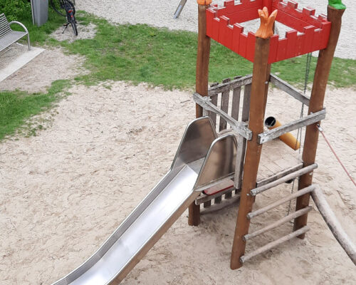 Das absolute Herzstück des Spielplatzes ist der imposante Hauptturm, der mit einer Höhe von rund neun Metern hoch in den Himmel ragt. Gekrönt wird der Turm von einem Dach in Form einer mächtigen Königskrone. Kleine Erker und kunstvolle Schnitzereien schmücken den Turm und sorgen für eine märchenhafte Atmosphäre, die Kinder und Erwachsene gleichermaßen in ihren Bann zieht. Vom Turm aus führen verschiedene Aufstiegsmöglichkeiten zu zwei aufregenden Rutschen.