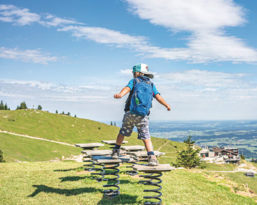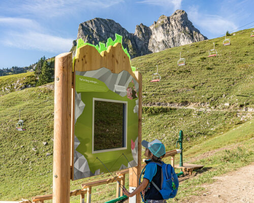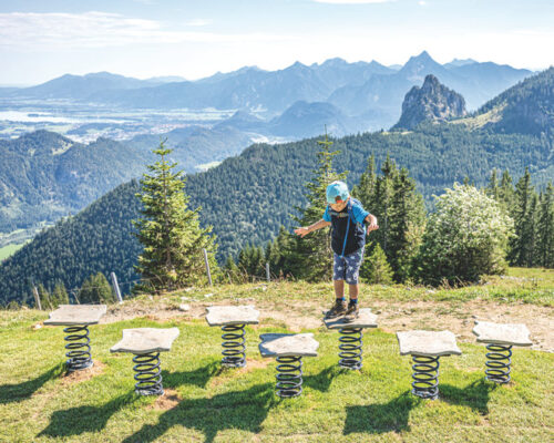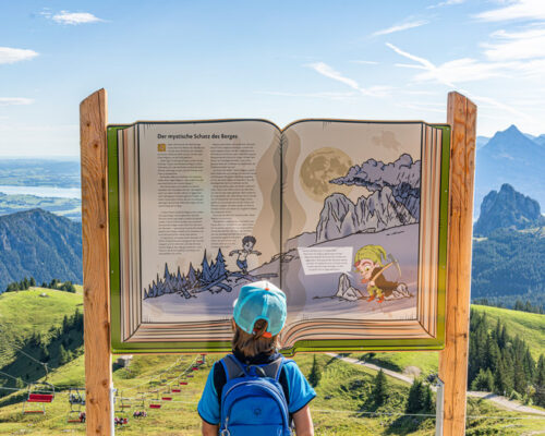Der Erlebniswanderweg ist mit interaktiven Stationen und Geschicklichkeitsspielen ausgestattet, bringt Forscher:innen Geologisches und Legenden näher. Da ist von mythischen Abenteuern die Rede sowie von den Venedigermännlein, die angeblich schon vor vielen hundert Jahren im Aggenstein nach verborgenen Schätzen geschürft haben. Wackelstämme und Felsenpfad, Baumstammwippe und Seilbrücke lassen die Schatzsuche garantiert nicht langweilig werden. Der Weg führt auf zweieinhalb Kilometern bergab zum Schatzspielplatz an der Hochalphütte.